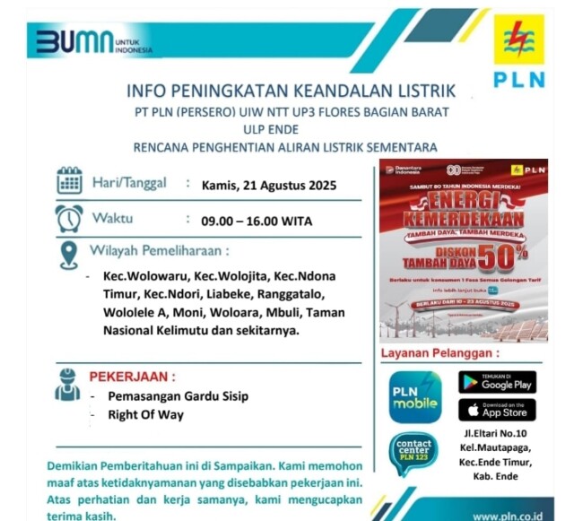 Redaksi76.com Dalam rangka peningkatan keandalan pasokan listrik serta mendukung pelayanan yang prima kepada pelanggan, PT PLN (Persero) Unit Induk Wilayah Nusa Tenggara Timur (UIW NTT) melalui Unit Pelaksana Pelayanan Pelanggan (UP3) Flores Bagian Barat, Unit Layanan Pelanggan (ULP) Ende, akan melakukan pemeliharaan jaringan listrik pada hari Kamis, 21 Agustus 2025.